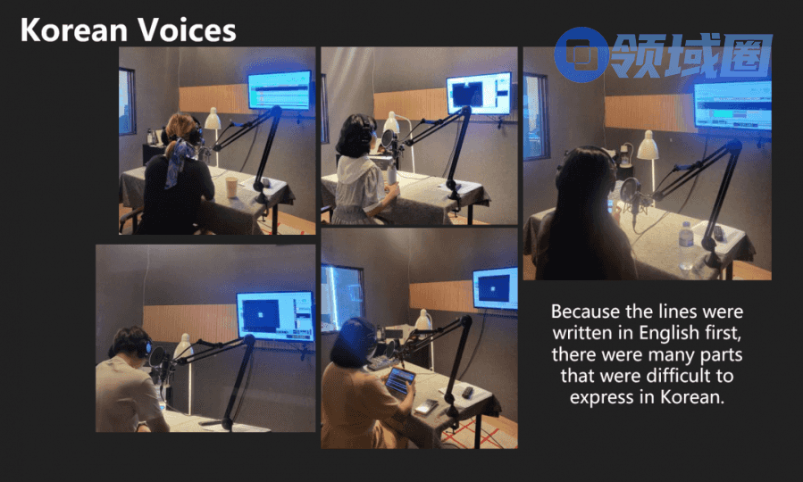 由于游戏的故事和剧本是首先用英语写成的,因此在韩语表达上有许多部分显得笨拙,这影响了录音过程,所以韩语录音是三种语言中最困难的。这让我想到,从下一个游戏开始,我应该同时用英语和韩语写故事,为这些部分做好准备。我通过一位母语日语的人的口译帮助,成功地进行了日语的声音指导工作。我最后录制的日语,由于此时我已经掌握了一些技巧,所以至少比别的更容易了。