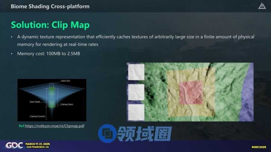 简而言之,剪切映射是一种动态纹理表示,能够高效地在有限的物理内存中缓存任意大小的纹理,以实现实时渲染速率。大家可以看到,随着相机移动进行滚动更新,相机范围内的纹理使用mip0,随着距离逐级递减,这种方式可以大幅减少内存占用,同时保证了近距离的精度。有着clipmap的加持,大大降低了内存的占用,原本100M的占用率一下子降低到了2.5M这个级别,使得在手游平台的落地变为了可能。