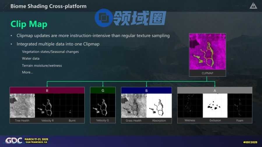 相比常规贴图采样,clipmap本身的更新会有更多指令消耗,所以我们决定不仅仅面数植被变色,而是基于这个基础上进行深挖,整合更多的信息到这唯一一张clipmap中。
