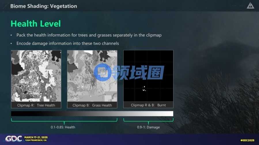 那不得不说一下健康度的概念,你也同样可以理解为植被四季变化的概念。我们分别在clipmap的R通道和B通道储存了树和草的健康度信息。之所以树木和草分开,是因为在实际应用中,两者差异明显,不能共用信息。