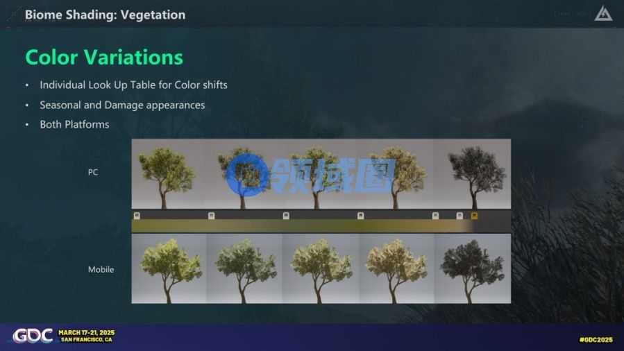 除了clipmap作为全局健康度或者说四季变化的输入信息外,资产个体则有与之对应的健康变化表现以及战损的表现。为每个植被资产基于季节创建色彩偏移以及烧毁效果,并将其储存在独立的look up table中。通过clipmap中的值采样LUT,得到看似随机但是完全可以掌控的结果。并且双端方案保持一致。