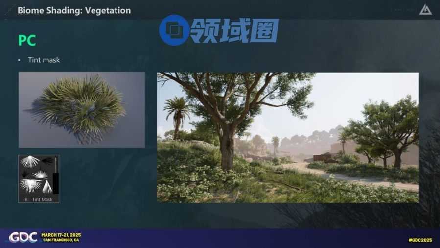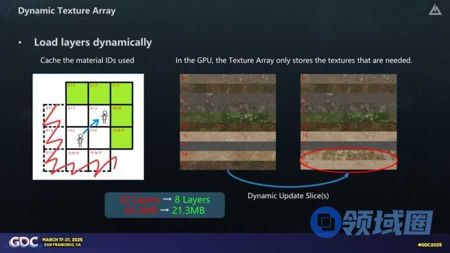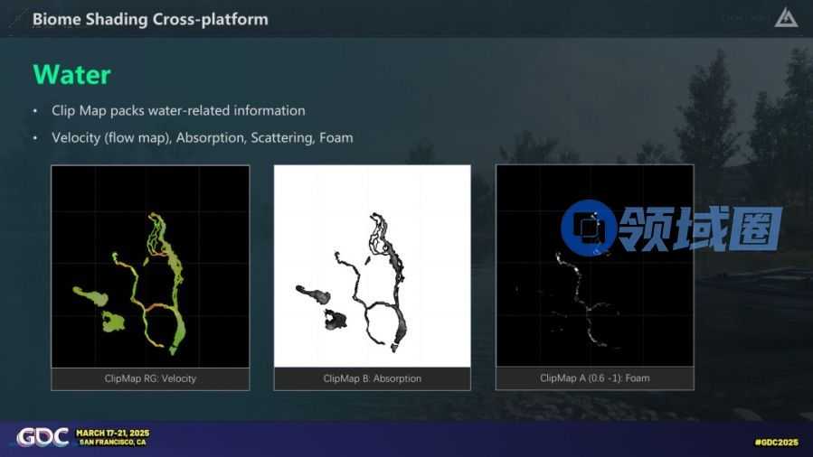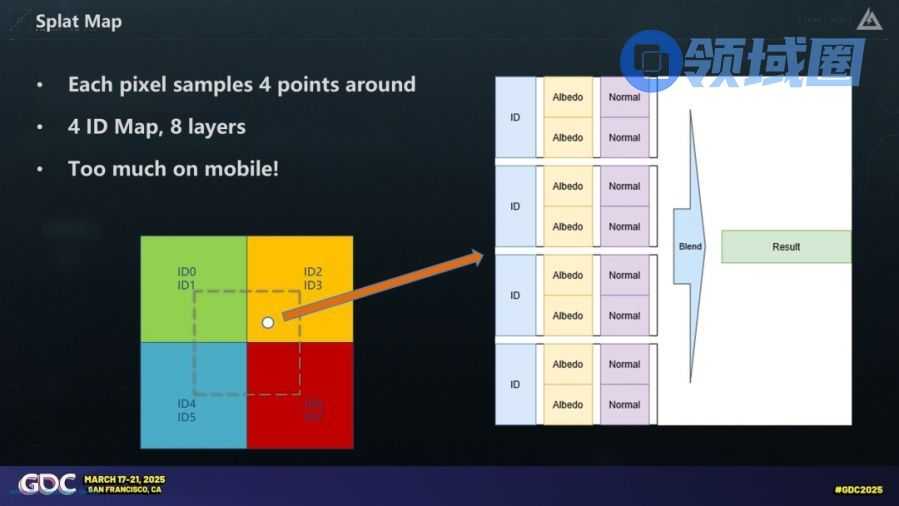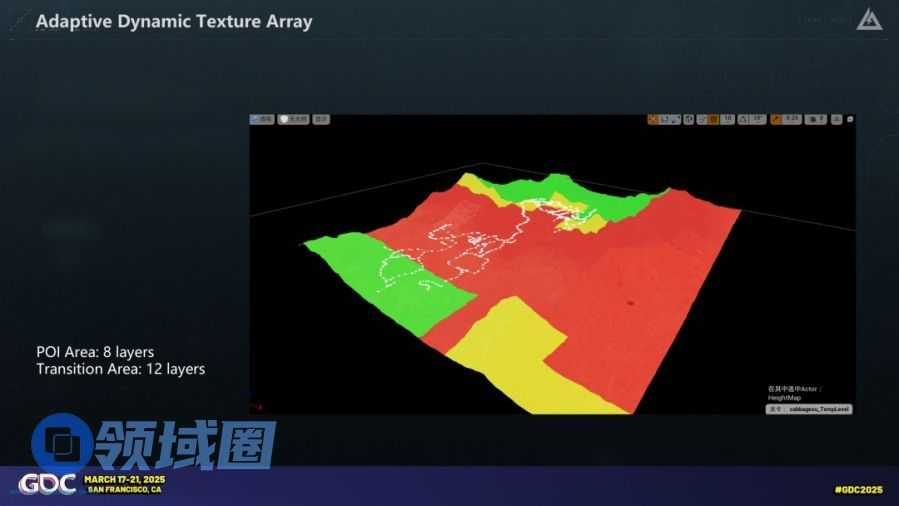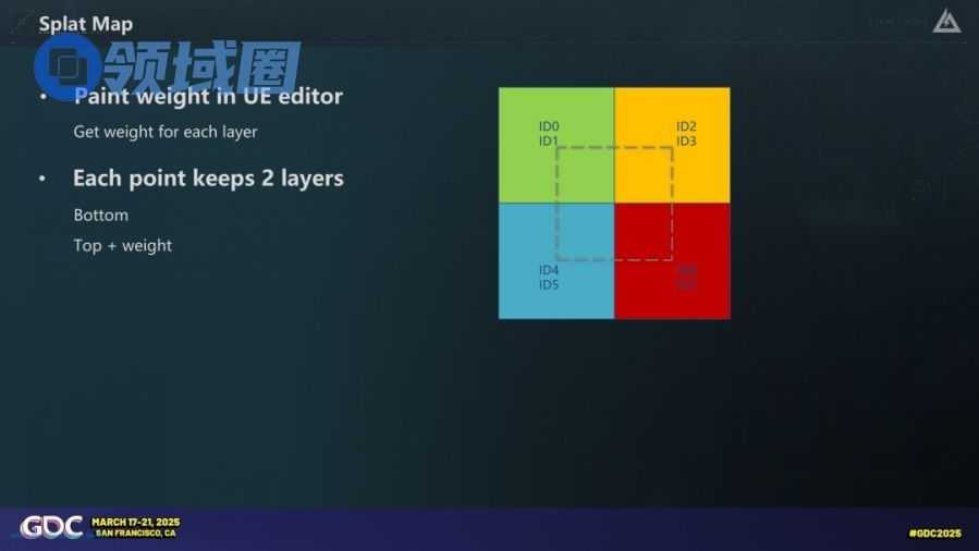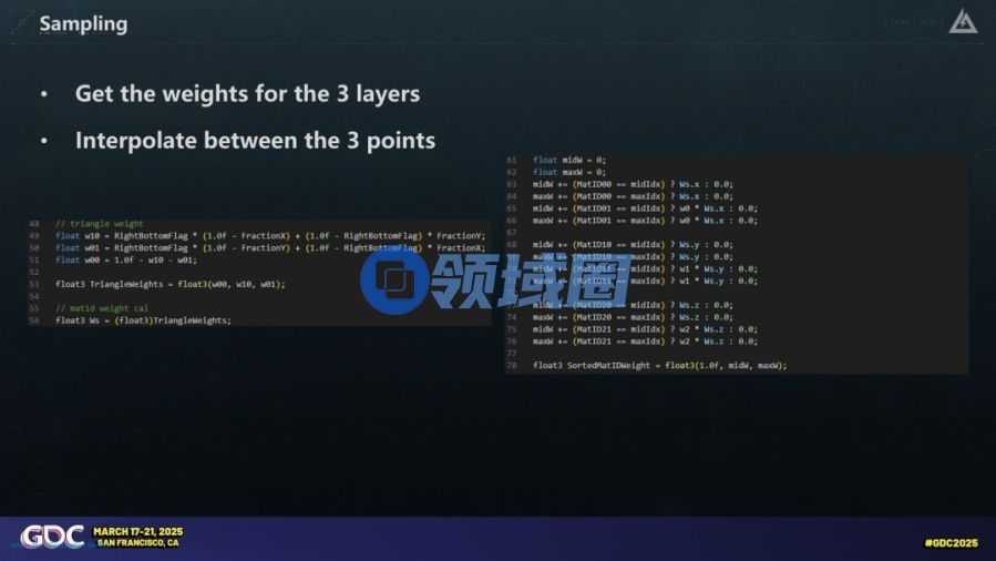 最终,我们能在每个三角形顶点获取各材质层的权重值,并完成混合计算。相关PPT稍后会上传至GDC Vault平台。接下来我将继续讲解。