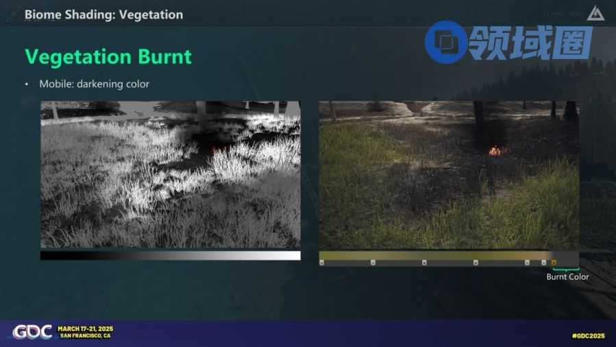 当植物的不健康程度偏移到极限的时候,就是我们的植物燃烧状态,用0.9到1来定义。它和四季变化共享一个LUT, 这种方式的好处在于可以实现平滑的燃烧过度,同时不需要增加更多的材质变体。
