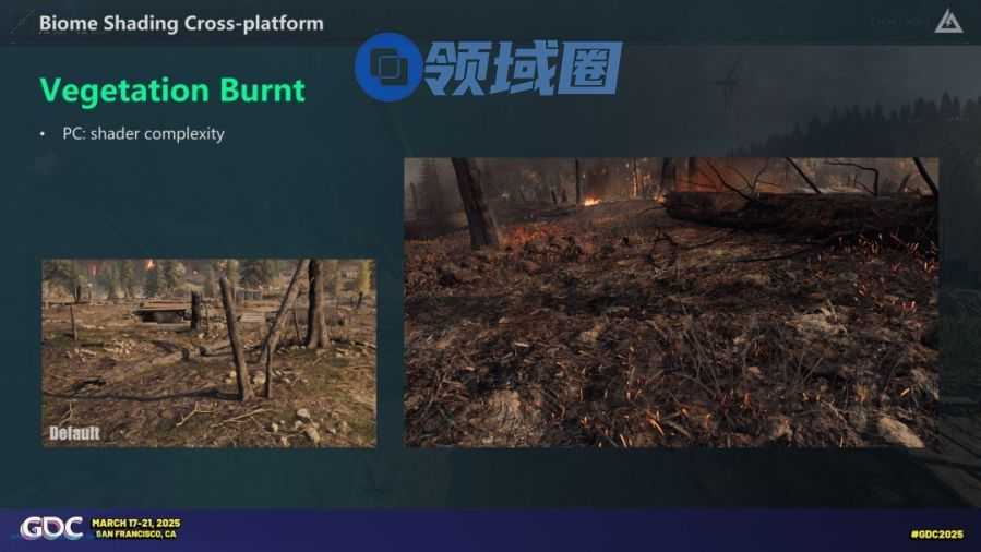 在PC平台为了营造更好的氛围感和真实度,会按照一定的规则整合弹坑以及燃烧特效等,材质上也会做更多的细节,比如烧掉的叶子,燃烧的火星,这些内容都可以轻易通过材质质量分级进行性能降配,从而保持跨平台风格和效果的一致性。