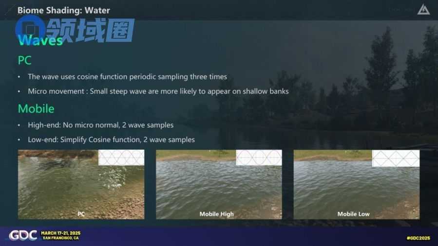 对于PC我们对波浪法线进行3次采样,每层之间的过度通过余弦函数作为权重进行混合,此外还有模拟了更锐利的小型波浪。