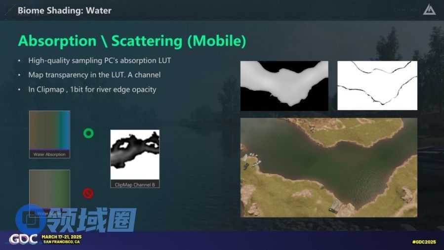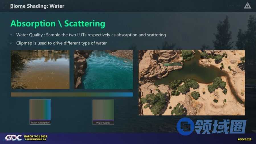 在颜色方面,我们使用剪切映射中的吸收蒙版来定义水的基本浑浊度,将吸收LUT和散射LUT映射到一起,共同描述水的颜色和散射颜色。这使我们无需额外的Draw即可处理自然的水表现,例如区分河流、湖泊以及泥沙被冲走的效果。
