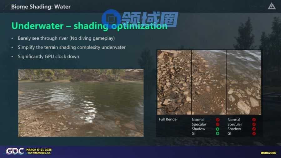 如前面讲的一样,大部分水比较深的地方几乎倾向于不透明状态,并且我们目前没有水下玩法,所以对于标准地形渲染,半透明衔接处,以及几乎不透明的深水域做了不同程度的性能优化,大大降低了GPU clock的开销。