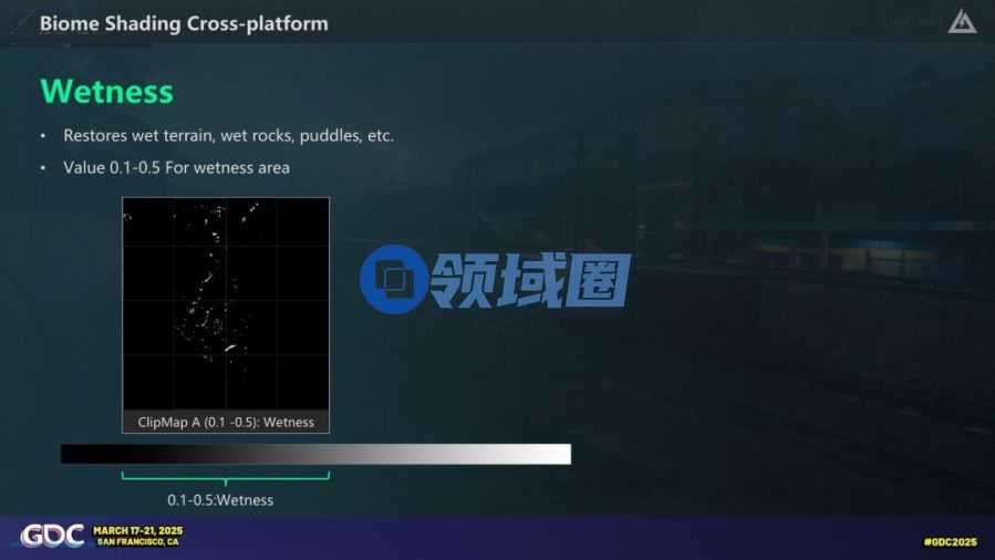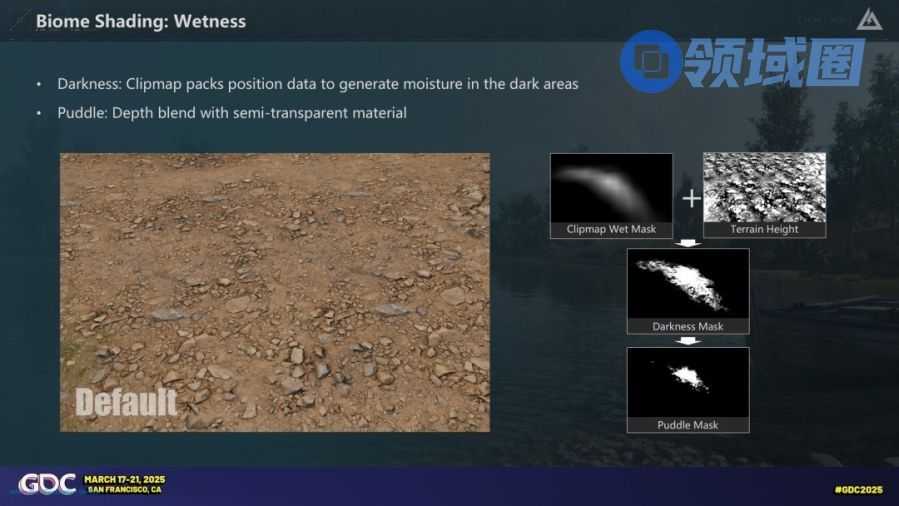 clipmap只有每米一个像素的精度,但是在地形上我们可以采样高度layer,与wet mask阈值混合后就可以获得正确丰富的darkness 区域,对darkness mask灰度裁切能够得到水坑的区域。