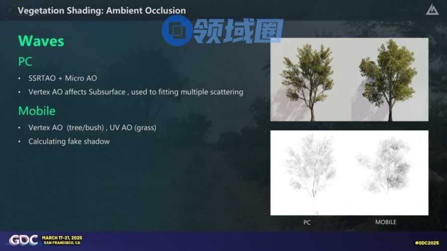 对于植物来说,全局光照对其最终表现影响很大,而其中ao是最重要的表现,对于PC我们应用了SSRTAO 作为全局光照遮蔽,同时从纹理中补充一些细微结构的ao。植物预烘培的顶点ao只会作用在subsurface上用来拟合多次散射的遮蔽效果。