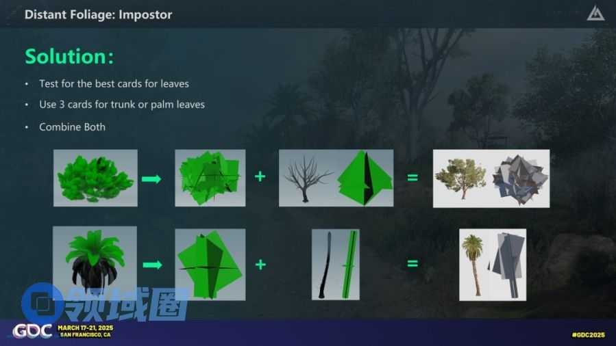 为了能在各个平台上都有比较好的性能和效果表现,植被远景的方案端游和手游有比较大的不同,因此我们准备了3套不同的方案来应对。
