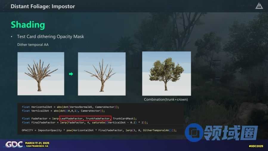 同时,我们对整棵树进行了dither temporal AA来得到顺滑的过度,通过vertex color存的信息区分,分别对树冠和树枝进行了不一样的调参设置,减轻树干插片感的同时,保证树冠有更高的密度。