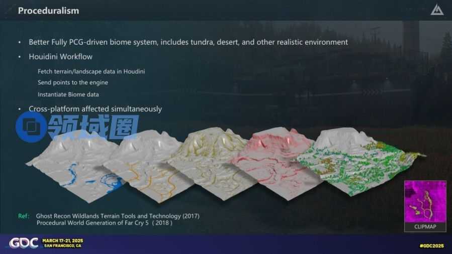 我们依然用的是基于houdini的开发流程, Offline生成结果。获取地形信息,根据特定的生成规律,生成点云,返回到引擎,并且实例化生态数据。由于这种做法比较普遍,我就不多展开了。相反,我将更多地讨论我们如何进行跨平台实现。当然,首先是我们刚才谈到的Clipmap。存储在其中的大部分数据都是由PCG生成和修改的。