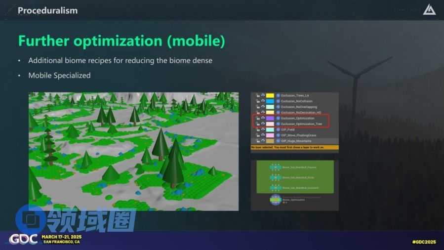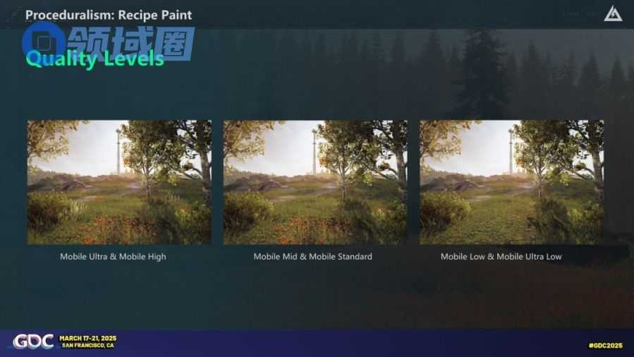 由于一切都由PCG控制,因此我们可以调整密度以减少三角形数量,或者替换某些类型的模型以减少Drawcall,灵活地实现每个质量级别的视觉和性能的最佳平衡。最后,我们得到了在感知上相似的PC和移动设备版本,同时根本上满足了两个平台的质量和性能需求。