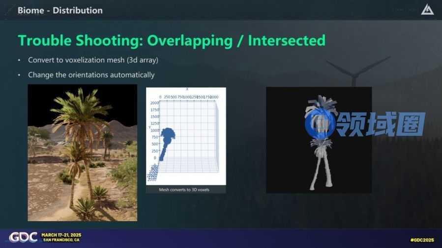 我们实现了自动修正来处理大块植被的重叠和交叉。像棕榈树总是最好的例子。首先,我们需要找到一种方法来验证它们是否交叉。因此,我们将几何体体素化,3D体素相当于具有值1的3D数组。如果多个3D数组的和的最大值等于2或更大,这意味着模型交叉了。接下来,我们自动更改其中一个模型的方向。然后,再次进行验证和修正。并反复这个过程,直到没有交叉。这样,我们在PC和移动设备上都确保了所有树木都放置得正确美观。