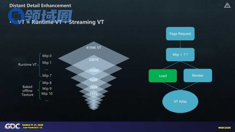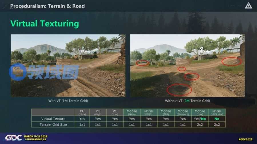 正如上篇中Lichuan之前提到的,我们使用VT技术处理地形贴图。VT本质上是一种纹理缓存算法,能有效节省带宽。同时这项技术支持在地形上叠加大量贴花,让我们能在PC和移动端实现高品质的地形渲染。在虚幻引擎中,我们采用的是adaptive VT方案。