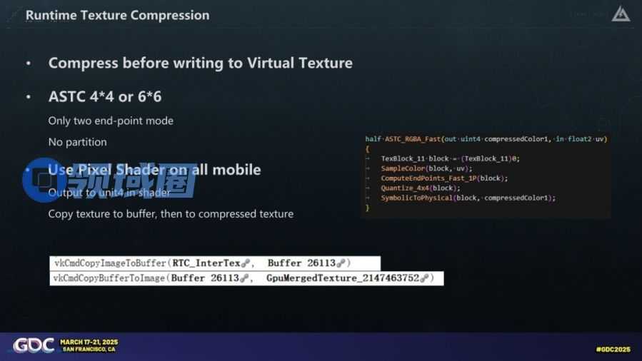 在移动端使用VT时,我们需要在写入VT前,对纹理进行运行时压缩。如果不压缩,每帧都会消耗大量带宽,导致设备发热。因此,我们将其压缩为ASTC 4 * 4或6 * 6格式。我们采用了极简算法,仅支持ASTC的双端点模式,不含ASTC的分区模式。出于兼容性考虑,我们在所有移动设备上使用pixel shader执行压缩。首先通过pixel shader输出到uint4纹理,每个像素128位,对应ASTC的block大小。接着将纹理复制到buffer,最后再复制给压缩纹理。