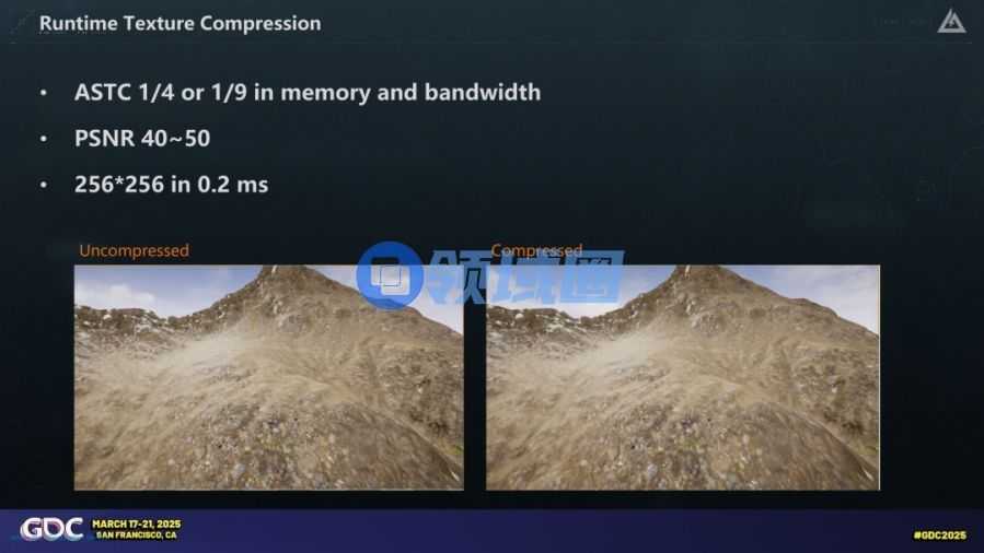 这是实际效果:带宽方面,每帧带宽减少到原先的四分之一或九分之一。PSNR值稳定在40到50区间,美术团队对最终视觉效果表示认可。单张VT页面的压缩耗时仅需0.2毫秒。