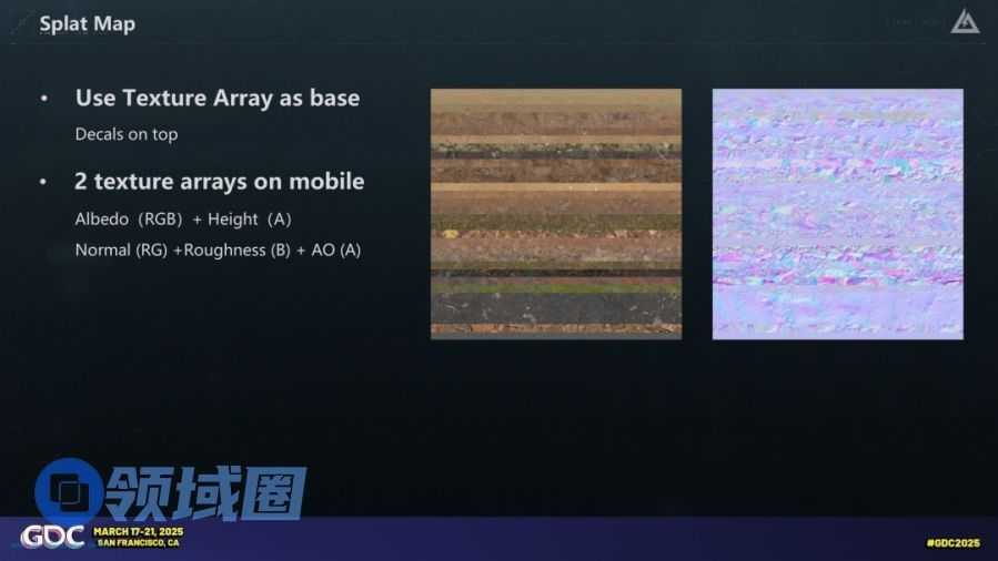 接下来聊聊地形贴图的基础——splat map。我们在双平台使用基本相同的splat map方案,这使移动端也能获得高品质地形。在移动端,我们将PBR纹理的多个通道打包到更少的贴图中。具体来说,我们用了两个texture arrays:一个存储albedo和heightmap,另一个储存normal、roughness及ambient occlusion。
