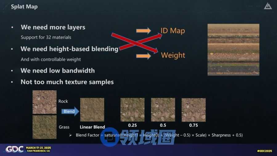 来看看先来看看我们的需求:美术想要至少32层材质混合,以提升场景丰富度。这需要某种形式的ID map方案支持。想要实现基于高度的权重混合,且权重可控——这种混合方式能让两个材质在大范围渐变过渡,使交界更自然。这需要地形上每个点需要为每层材质单独存储权重值。同时受带宽限制,纹理采样次数必须严格控制。但,等等,常规的每层权重方案(比如虚幻引擎默认方案)无法支持如此多层,因为每一层贴图都需要采样做混合。而ID map方案(如《孤岛惊魂》《幽灵行动》采用的方式)又不支持权重混合,每个点只能指定单一材质ID。我们该怎么办呢?
