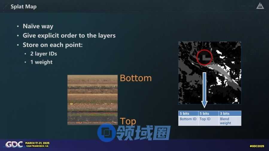 让我们从最基础方案开始,化繁为简。首先为所有材质层设定明确的顺序,采用从底层到顶层的覆盖逻辑。在地形每个采样点存储两个layer ID:底层(bottom)和顶层(top)。禁止同一位置出现三层叠加。这样底层权重始终为1,只需存储顶层(top)的混合权重值。我们采用每米一个采样点的ID map精度存储这些数据。