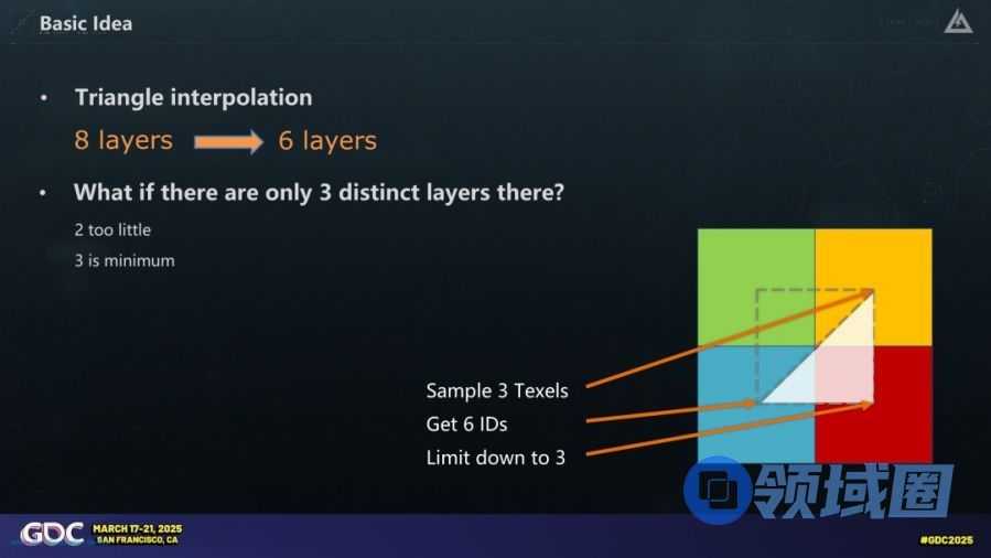 首先引入一个小技巧:我们可以将插值计算范围从方形区域改为在三角形区域进行插值。这样能将材质层采样数从8层降至6层。虽然地面可能出现轻微三角形pattern的感觉,但通过合理的层混合,这种pattern几乎不可察觉。不过6层采样依然偏高——实际开发中美术师很少在同一区域叠加这么多层。如果我们利用这个特性,将不同的ID数量从6个减少到3个呢?这样虽然仍有6个ID编号,但实际只需采样3个材质层。经过实际测试,我们发现3层是保证正常过渡的最低标准,同时足以呈现复杂的地形效果。