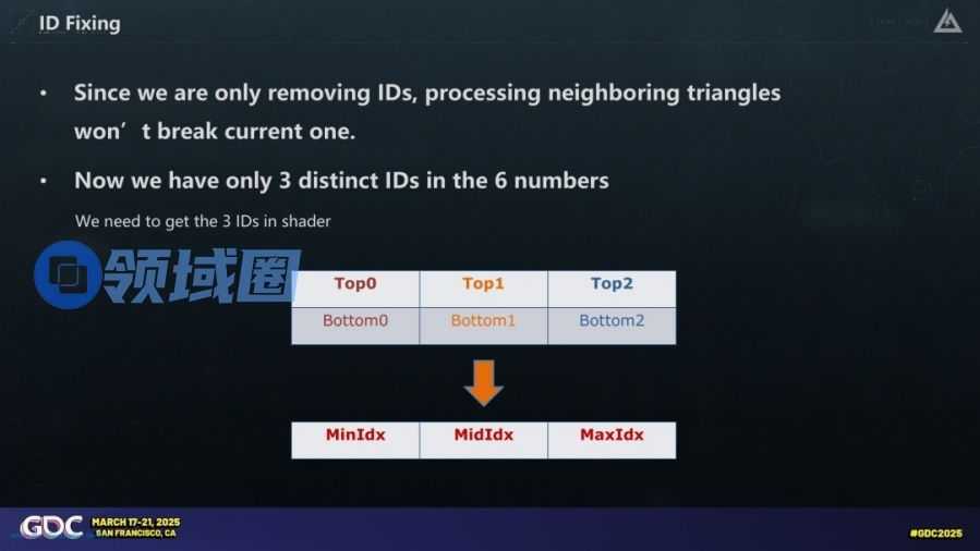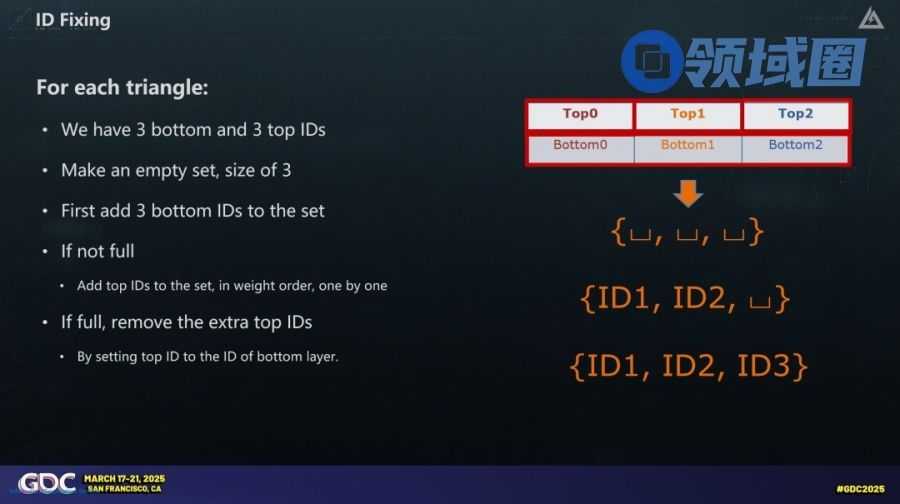 那么我们如何从三角形内的6个ID中提取3个独立层?我们通过离线ID修复流程实现这一点。当美术师在编辑器中绘制权重时,每个三角形会包含6个层ID:3个底层ID和3个顶层ID。流程开始时,创建一个容量为3的空集合。首先将3个底层ID全部加入集合。若集合未满(存在重复ID),继续按权重从高到低的顺序逐个添加顶层ID。若集合已满,则丢弃,具体做法是将多余顶层ID设置为与底层ID相同。