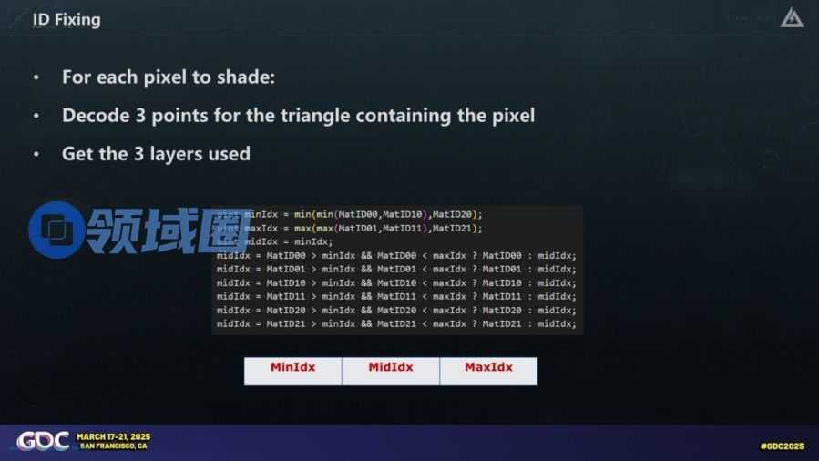在shader中,每个待渲染像素首先需解码3个ID map采样点,获取6个ID编号及3个权重值。随后通过这段代码,从6个ID中提取出min、mid和max三个核心ID。