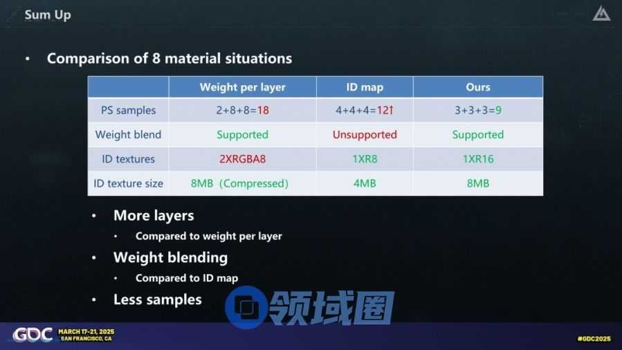 总结来看:相比传统的weight-per-layer方案,我们的方法支持更多材质层叠加。相较《孤岛惊魂》《幽灵行动》采用的ID map方案,我们实现了权重混合功能。传统ID map方案要实现过渡效果,必须创建包含两种材质的混合层,这会额外消耗内存。而我们的方案可以任意两层材质自由混合,无需占用额外内存。此外,这种混合机制还能实现类似《巫师3:狂猎》的法线叠加与衰减等高级效果。