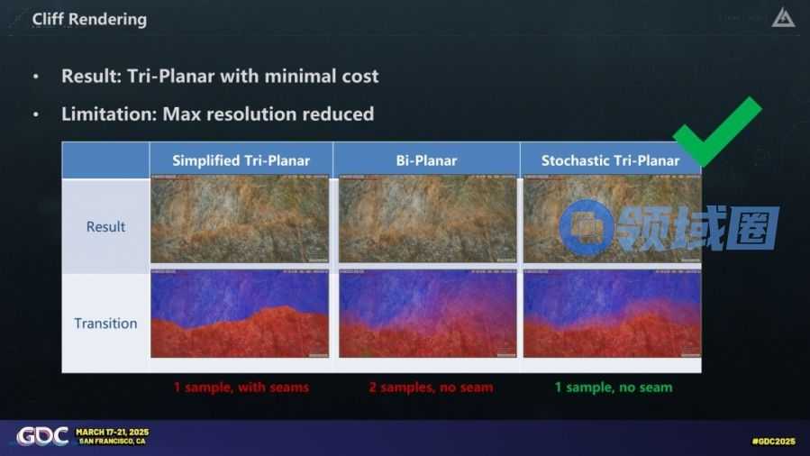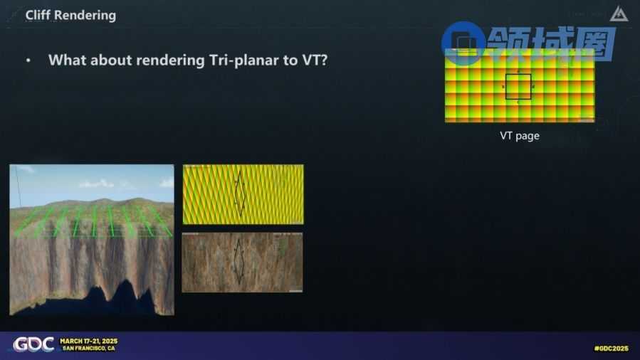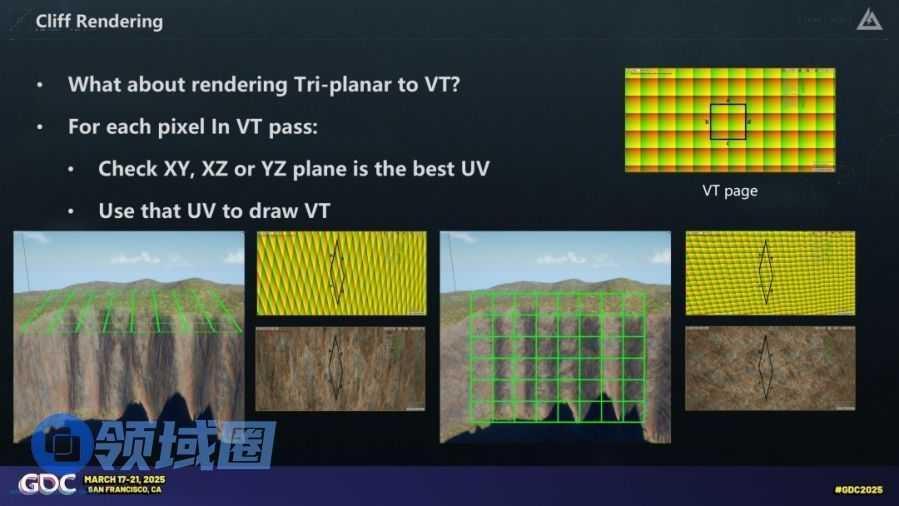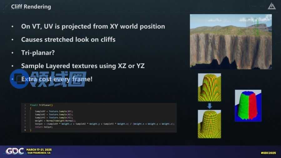 关于悬崖渲染:在VT方案中,UV通常基于世界坐标的XY轴投影,这会导致悬崖面出现纹理拉伸。常规解决方案是采用tri-planar映射——需要额外增加XZ和YZ轴的纹理投影采样,并进行混合。但这会导致每帧的额外性能开销。目前存在tri-planar的优化方案,不过通常仍需在base pass中增加纹理采样次数。