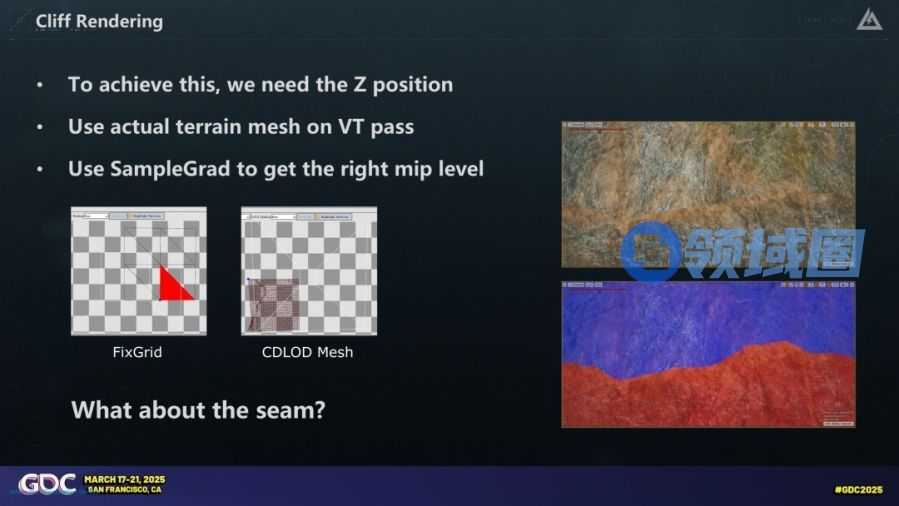 要实现这一点,我们需要引入Z轴坐标。必须将实际地形网格输入VT生成流程,而非之前的quad。注意要使用SampleGrad方法——由于每个像素的UV动态变化,必须手动指定正确的mipmap层级。这是优化后的效果:可以看到纹理拉伸消失了,但出现了明显接缝。如何消除接缝?