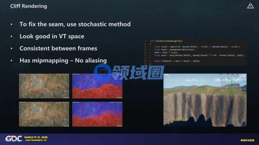 最终我们以极低成本实现了类似Tri-planar的效果。我们也尝试过bi-planar方案,虽然混合效果更好但性能开销更大。随机方案在效果与性能间达到平衡,最终成为游戏内的实装方案。不过直接在VT中渲染悬崖存在一个限制——当玩家近距离观察时,最大分辨率会有所下降。我们认为这是一个可接受的取舍。