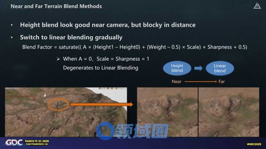 这里还有另一个提升视觉质量的技巧:使用高度混合时,近处效果良好,但远景会出现块状瑕疵——这是因为远距离混合使用高LOD层级的mipmap,精度不足导致。除了调整远景tiling之外,我们还引入了另一个技巧。我们在远处采用线性混合方案:随着距离增加,逐步过渡到线性混合模式。这种处理使过渡更柔和,有效解决了块状瑕疵。