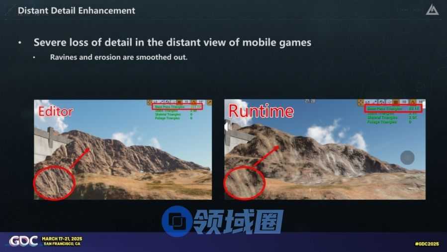 这里还有另一个运行时出现的问题:美术师在编辑器中精心雕琢的地形细节,在移动端运行时——尤其是远景中——会显得过于平坦,沟壑与侵蚀细节被平滑掉了。