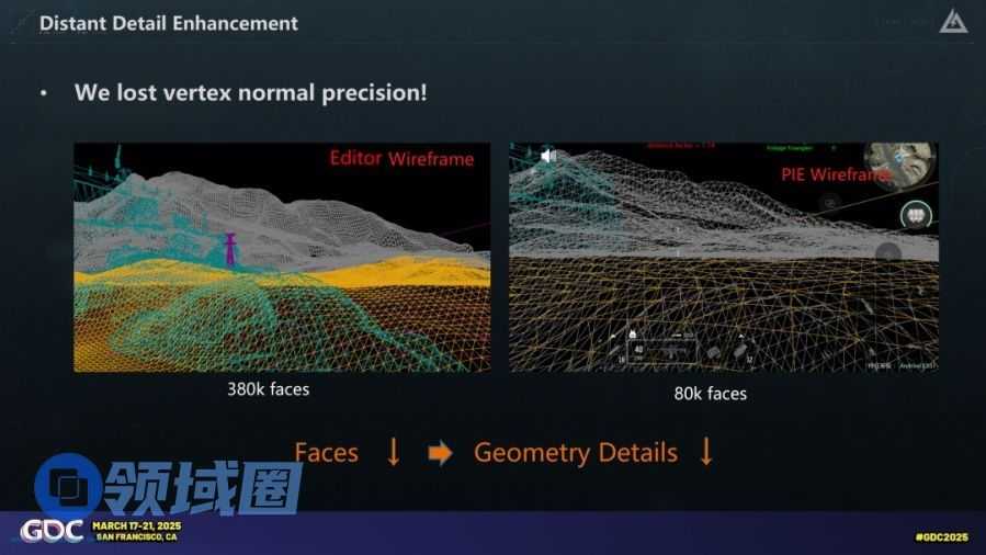 根本原因在于:编辑器中地形使用38万三角面,而运行时版本仅保留8万面。出于性能考量,我们大幅降低了远景区域的网格密度。这意味着通过顶点法线(vertex normal)表现的几何细节也随之减少。