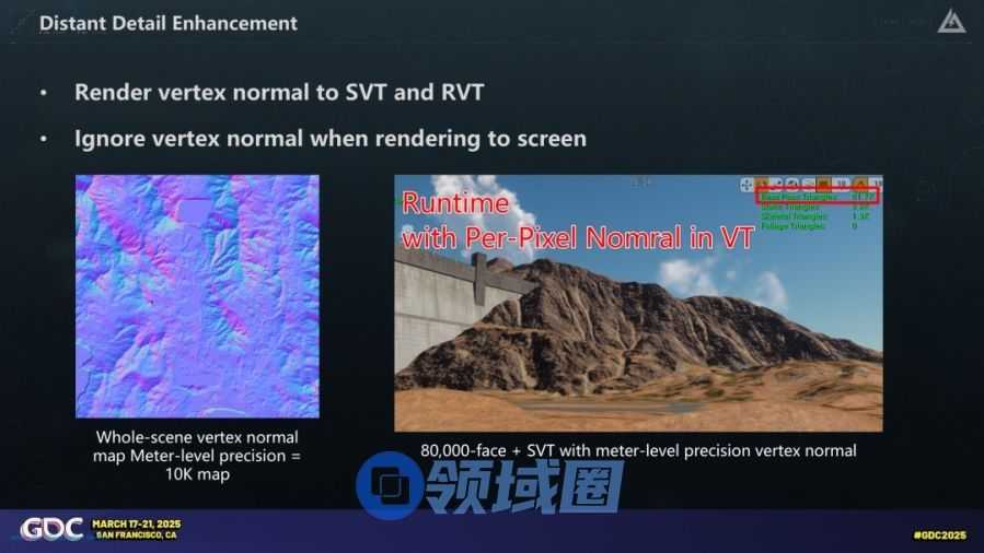因此,我们将顶点法线(vertex normal)烘焙到SVT中,并在最终渲染时完全忽略地形网格自带的法线信息——所有法线数据都来自SVT。但SVT与近景RVT混合时,必须采用相同的法线生成逻辑才能避免接缝。这意味着在生成RVT时,同样需要通过实际地形网格实时渲染顶点法线——就像处理悬崖渲染时一样。最终效果令人满意:远景地形细节完全保留,不再出现细节丢失。美术团队甚至可以通过手动调整离线生成的SVT数据,自由定制远景视觉效果。