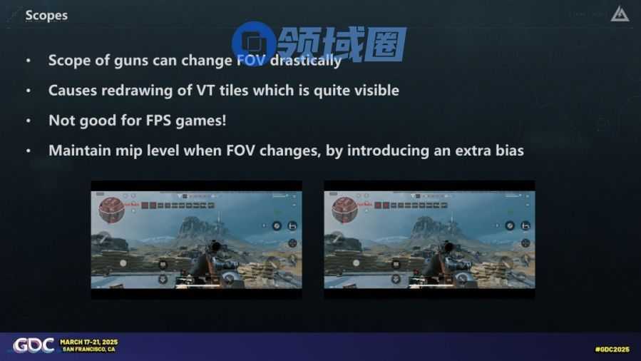 此外,游戏中还有许多细节调优案例。例如在这款快节奏FPS游戏中,开镜时摄像机FOV(视野)会急速变化,导致VT需要立即重绘更高精度内容——这会产生明显的地形突变(pop-in)现象,干扰玩家索敌。因此我们在开镜时引入额外偏移值(bias),使FOV变化时维持当前mip level。该方案显著提升了操作流畅度,代价是开镜时地形会略显模糊。