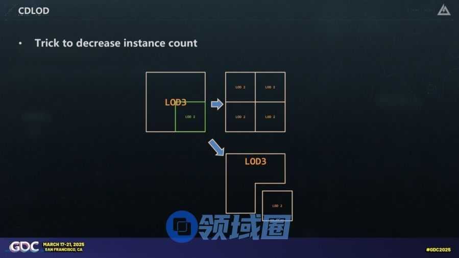 此外,我们还通过一个小技巧进一步降低实例数量。常规情况下,当请求某地形tile的高LOD层级时,会将其细分为四个高LOD子tile,导致需要4个实例渲染。但我们采用顶点着色器裁剪方案:将低LOD网格中需要细分的区域切割出来,仅对该区域进行细分。切割操作通过顶点着色器动态调整顶点位置实现。这使得总实例数降至2个,且每个实例保持相同顶点数,从而减少总顶点绘制量。
