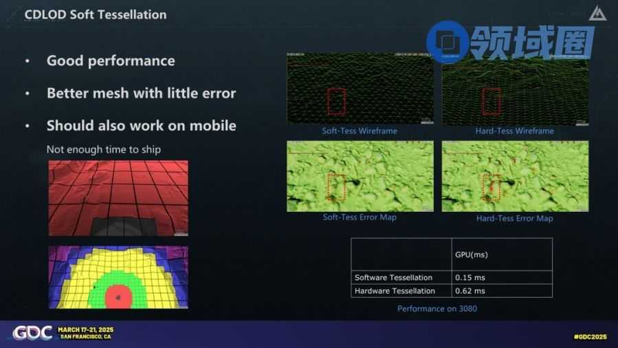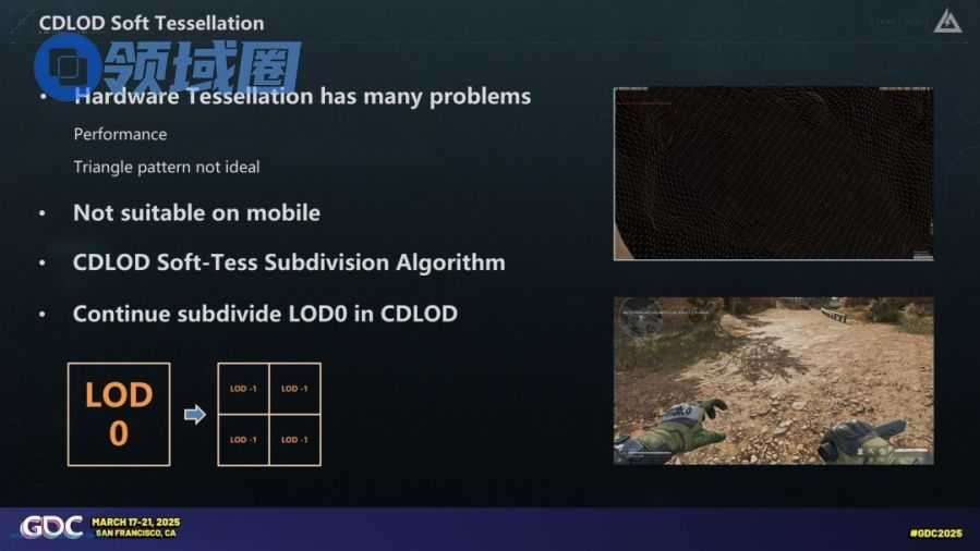 关于曲面细分(tessellation)。硬件曲面细分存在许多问题。它存在性能问题,三角形分布模式也不够理想,可能导致更多误差。而且在移动端并不适用。因此,我们实现了软细分方案。这是对CDLOD的自然延伸——通过为地形块引入LOD -1、-2等级别,从VT中采样高度图来调整几何结构。