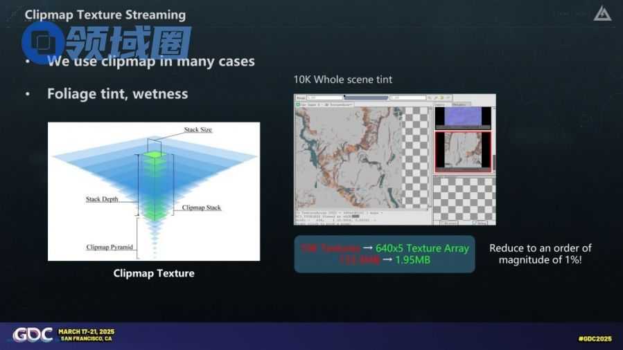 为了增加生态表现得丰富性,我们不希望通过完全的随机shading来实现这件事情,视觉效果丰富但可信度比较低,如果通过材质变体实现,会让DrawCall急剧增加,也不宜与管理和迭代。所以,在开发的早期我们尝试采样了一张大型纹理,来为其提供可控的色彩变化。但是对于10x10的开放世界来说,10k分辨率占用内存约100Mb,这在移动端仍然没有办法落地的,于是乎,我们引入了clipmap。