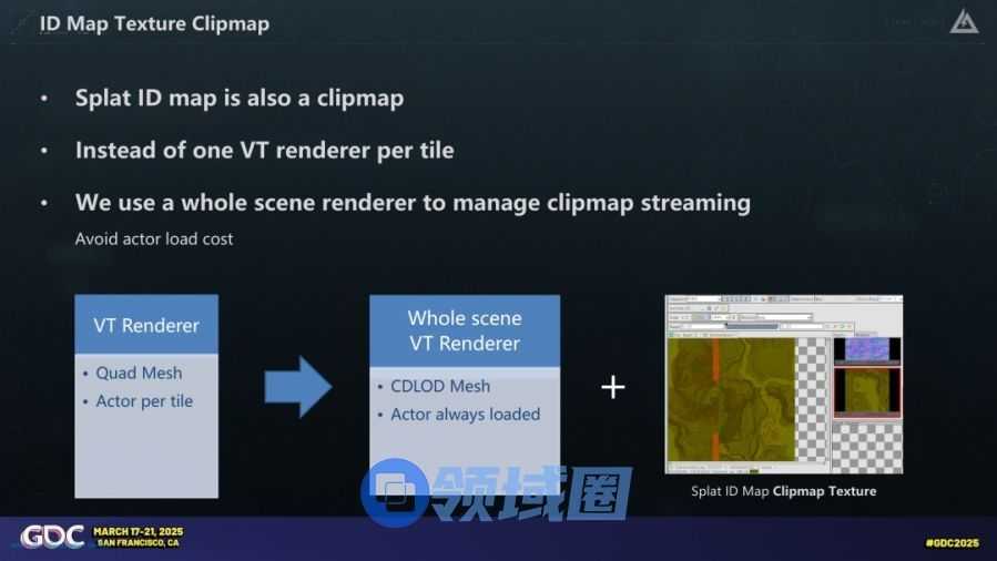 我们把splat ID map也改造成了clipmap结构——只有近处才需要高精度数据。在实现上,不再为每个区块单独启用VT renderer,而是通过whole scene VT renderer统一管理clipmap流式加载。这样减少了Actor数量,卡顿现象也随之缓解。