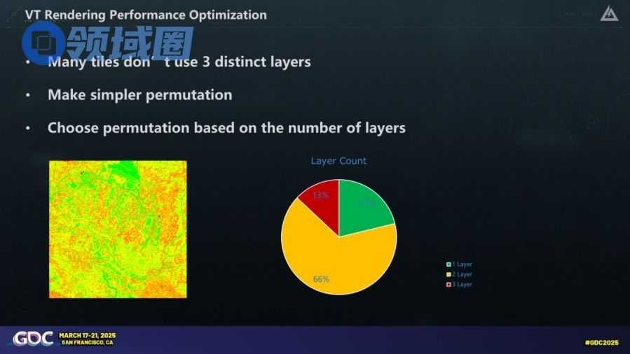 还有一个优化思路值得分享。虽然允许每个像素混合3种不同图层,但实际很多区块用不到这么多层——比如大面积单一图层(草地、泥土)或仅混合两种图层的区域占主流。考虑到高频更新的高精度LOD VT页会频繁切换进出physical texture,我们为着色器制作了三种变体,根据即将渲染的VT页实际使用层数动态选择着色器变体。这些数据是离线统计生成的,内存开销极小。
