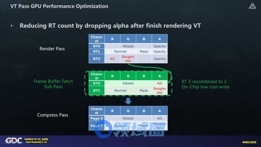 在移动端,我们可以优化VT流程中使用的渲染目标。理想情况下,VT内只需两张纹理,通过通道合并来降低基础通道的采样次数。但由于Decal存在透明度混合,渲染VT页时仍需将透明度通道单独保留。之后通过subpass(或frame buffer fetch)对通道进行重组,使其达到理想布局。这种操作利用移动端的on-chip内存,无需回传到主内存。接着就能进行ASTC格式压缩。更进一步——如果检测到某个Tile没有透明度混合需求,就直接以理想通道布局绘制到渲染目标。这类信息同样是通过离线烘焙获取的。