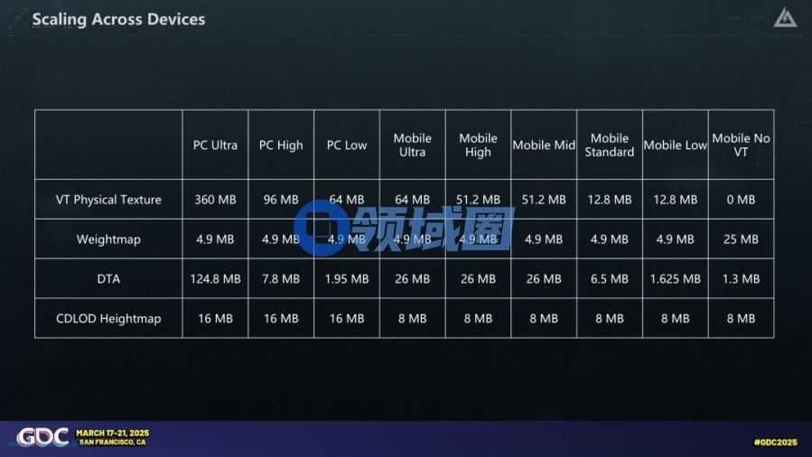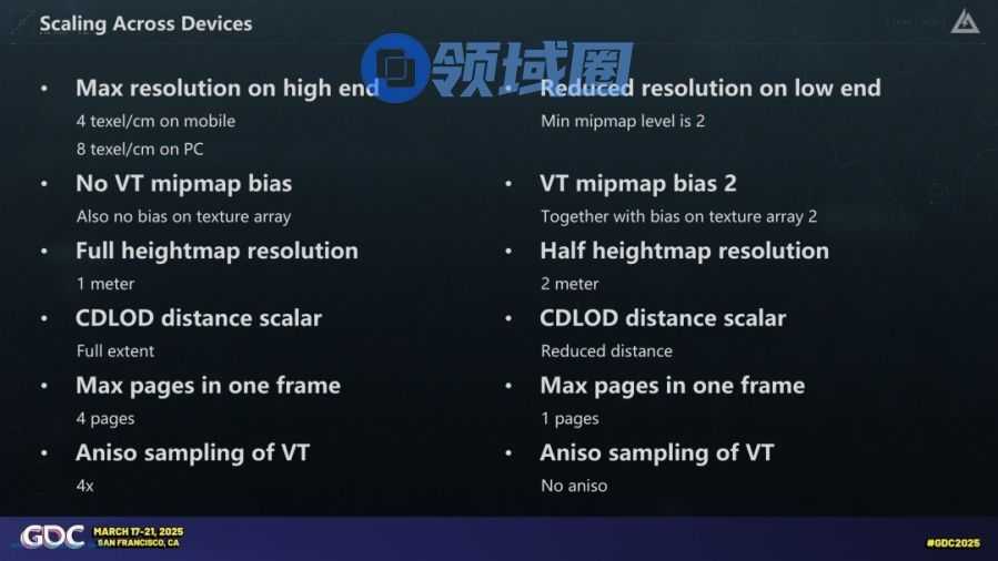 在设备适配Scaling方面,我们开放了多项参数调节开关。比如说,不同设备可设置不同的最大分辨率——降低分辨率意味着需要更新的VT脏页更少。我们还可以调节VT的mip偏置,配合纹理数组的mip偏置。这在低端机上能节省部分内存。高端设备使用1米精度的地形高度图,低端设备则回退到2米精度——这意味着需要着色的顶点更少。地形网格LOD距离缩放系数提供了另一种优化手段——通过加快远处网格的密度衰减速度来减少顶点数量。每帧允许填充的页面数量也可以设限,从而降低卡顿概率。此外,各向异性纹理采样(aniso-texture sampling)的等级也能通过画质档位灵活控制。