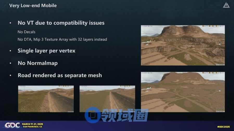 针对极低端移动设备,我们单独设计了一套地形渲染方案。这主要是出于兼容性考虑——部分低端机型存在VT支持问题,因此必须找到不依赖VT的替代方案。具体做法是:在base pass直接渲染splat map。由于缺乏动态纹理数组支持,只能使用完整32层低分辨率纹理数组。将每顶点splat层数压缩到单层,实际上回退到ID贴图方案。移除法线贴图(normalmap)。由于缺乏Decal支持,道路需要作为独立mesh单独渲染。
