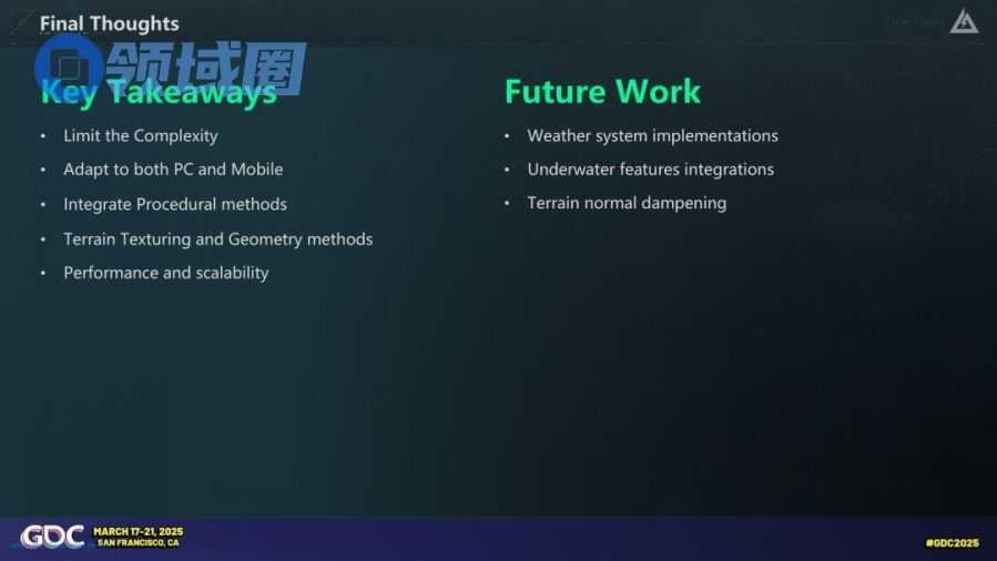 以下是今日分享的核心结论:在地貌与地形渲染方面,我们通过合理控制复杂度实现了跨PC与移动端的兼容适配;运用程序化生成方法加速迭代并提升品质;针对地形贴图与几何结构开创了独特的解决方案;并通过性能与scaling调优确保方案落地。关于未来方向——我们计划完善天气系统的实现方案,开发水下特性,同时加强地形法线混合和衰减的调试以进一步提升视觉表现。