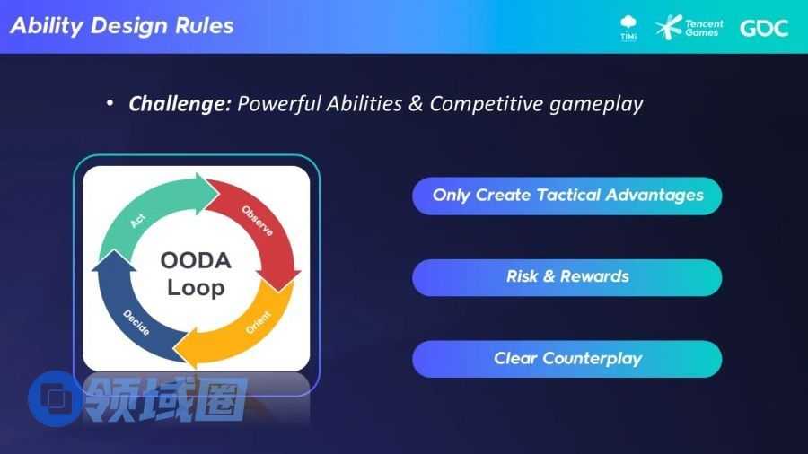 在赋予玩家超能力的同时,我们面临一个关键挑战:强力的技能非常很好设计,但如何在保证战术射击的竞技公平性下做出有趣又有效的技能呢?我们从经典的战术循环——OODA循环中总结了三个设计支柱,技能的设计必须要遵守以下三个原则: