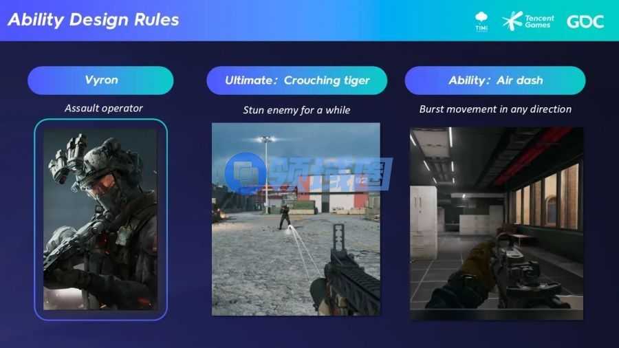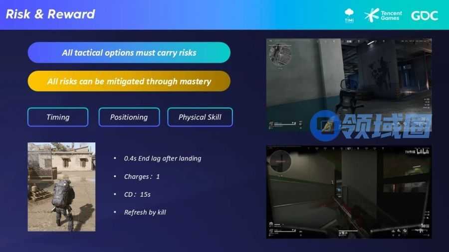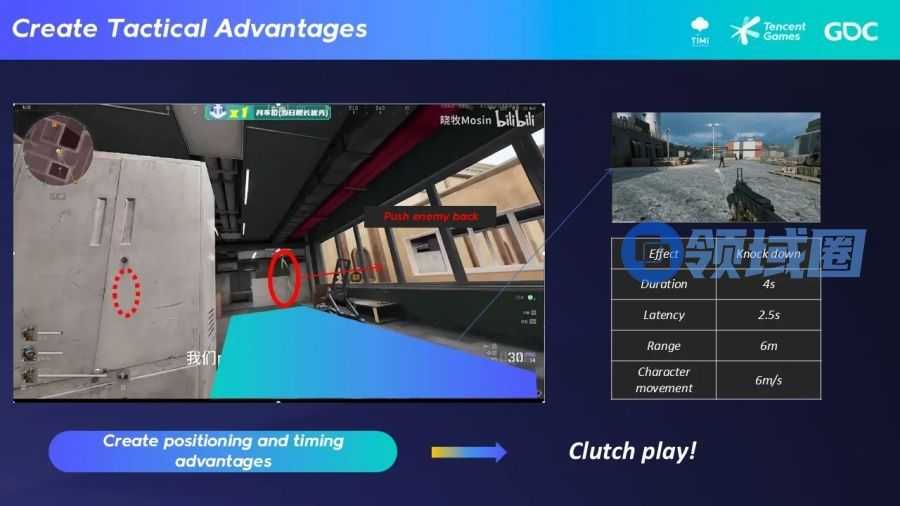 这个案例能很好的体现什么是战术技能。它是关于创造时机、夺取地图控制、建立信息优势。我们更加关心技能如何帮助玩家创造进攻和防守的时机,关注什么样的技能能帮助玩家控制地图建立区域优势,关注如何帮助玩家获取信息,为他们的预测推演、计划制定提供支持。我们设计技能的目的是为战斗带来一个全新的技巧维度,保证枪战的魅力且不只是枪法,这在丰富玩家游戏体验的同时也让玩家有非常多的办法去创造不可能。