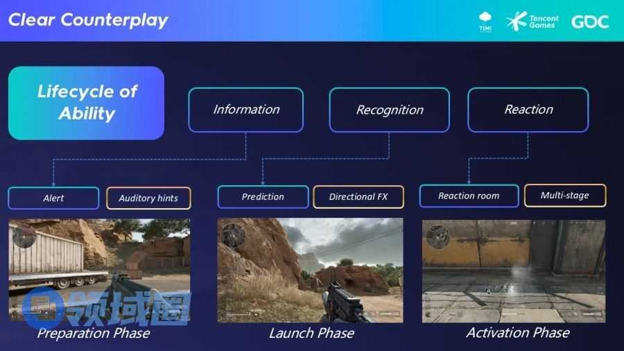 技能设计的最后一个准则是“为防守方提供清晰的反制空间”。强大的技能不应该让对手绝望,每一个技能都在信息、识别、反应窗口上为反制手段预留了对应空间。以威龙的大招为例,从启动到生效的每个阶段,我们都设计了细致的反制设计。比如敌方威龙激活大招时,有一个非常明显的3P音效,这是第一层警告:有人要干坏事了,你和你的队友需要开始收集信息准备应对。大招的飞行轨迹是清晰可读的,帮助防守方快速做出决策。当技能落地时,总是有一个反应时间留给你,所有的音效、特效、UI都在引导你做出反制行动。