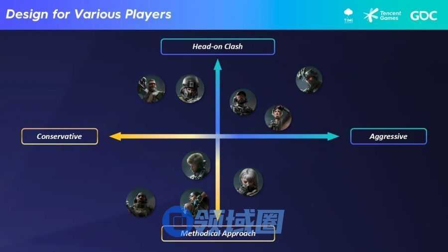 事实上,威龙只能代表一部分喜欢正面强攻的激进型玩家,我们希望所有玩家都能找到自己的英雄之路,所以考量玩家的个性化风格,是我们定制英雄体验时的首要步骤。你可以看到,我们有一个基础的四象限框架用来定义最主要的角色风格