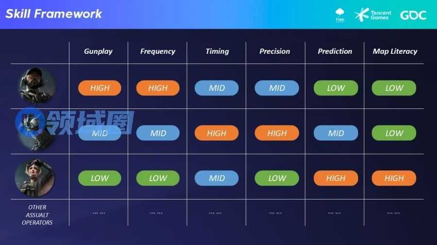 然后,对于同一战斗风格的不同干员,我们会让他们对玩家能力模型的考验有所差异。我们会把一个主要风格拆解到六大技巧维度。通过调配这些维度,我们能够创造出一个广泛的具有差异化体验的战斗方式。举个例子,这个图展示的是三个突击位角色,但是他们完成突击任务的方式全然不同。这是为了保证每个干员的战斗方式能够真正匹配某类玩家的个性化喜好,能够吸引到一个特定风格类型的玩家群体